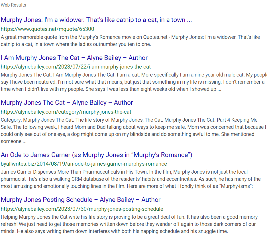 Today her search was for me! She did add “the cat” so I would not be confused with the role James Garner played in Murphy’s Romance. I was shocked that she found my blog! I am almost famous! Thank you, Mom.