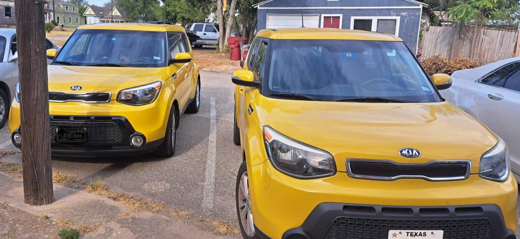 Besides our beloved camper van, Mom and Dad have a second car for every day use. It is a yellow Kia Soul. They explained that they love it, because it is fun to drive, the right size for most things, and they can almost always find it in a parking lot. Last night they learned that may be a little harder to identify it in our small town of 1,675 people. A new couple moved to town, and they also drive a yellow Kia Soul! Mom took a picture after she parked next to them last night.