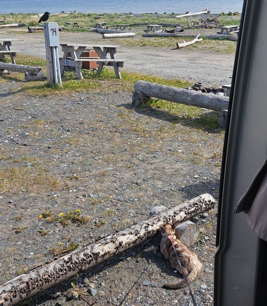 The seagulls stayed over the water, which was fine. The Ravens, however, hung out close in hopes that Mom might feed them. I hated the noises they made on the van roof. Miko liked exploring outside on her lead. When a Raven would land close, Miko would go into hunting mode. Silly kitten seemed to think she could catch one! It got really scary when 10 of them totally surrounded her. Missy and I went out to scare them away. She may be a pain, but I didn’t want a conspiracy of Ravens carrying her a way. I’ll admit that it would be more fun to tell you about if they were a murder of crows, but these truly were Ravens.