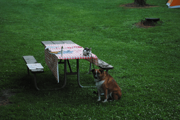 I don’t know how long I slept, but the scary noises have stopped, and Fred has left his spot on the bed. I crawl out when I hear the side van door open. I see Fred on a leash with Dad walking in the grass. The cord is long enough for me to go to the door, but I realize I would need a leash to actually go outside. Mom scoops me up to cuddle me before she puts me back on the bed. She starts pulling things out of the refrigerator to put in a bag along with bread and potato chips. I think I’m going to be left all alone when she takes the bag and goes out the door. I am so happy when a minute later she comes back to put me on a leash! We walk over to a funny table that is in the shade. She takes things out of the bag. Dad and Fred join us. Fred says this is called a picnic. Mom and Dad talk about what they want on sandwiches. Fred says sandwiches are great. I don’t think they sound good, but I climb up on the table to watch what’s going on.